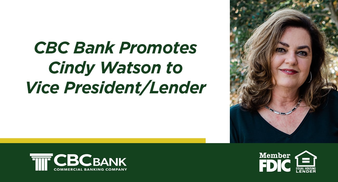 Tifton, GA – CBC Bank is pleased to announce the promotion of Cindy Watson to the title of Vice President/Lender, in recognition of her continued leadership, experience, and commitment to customers in the Tifton community.